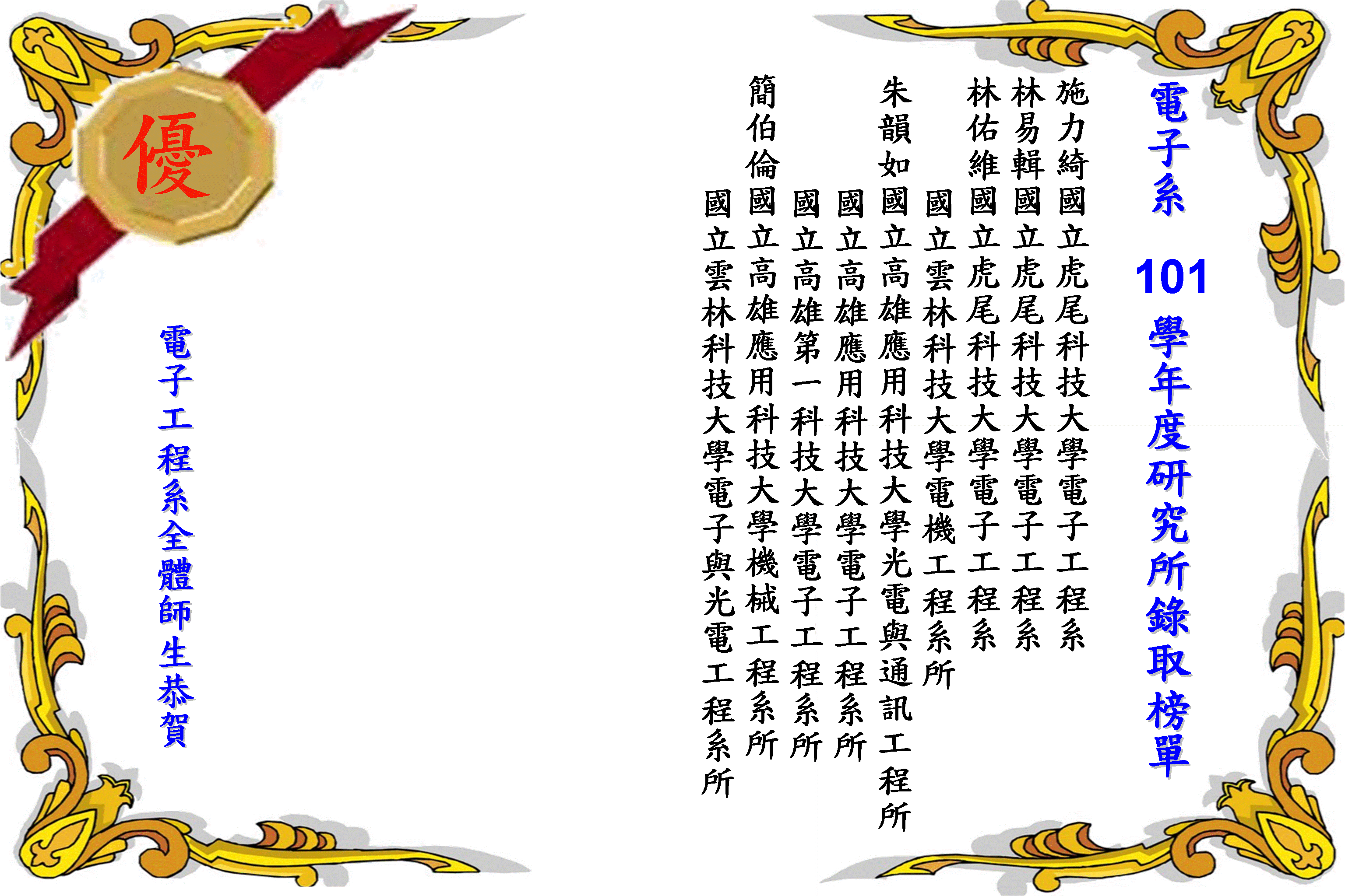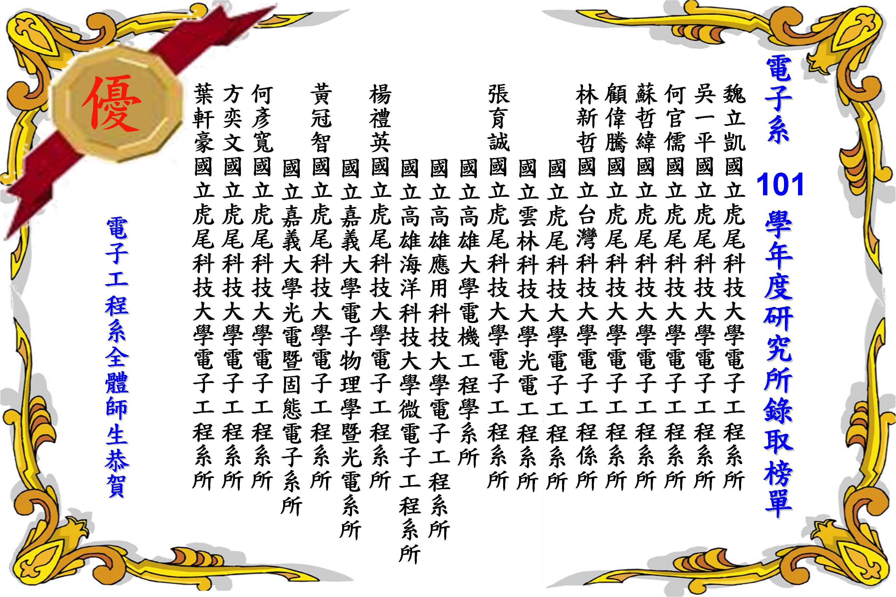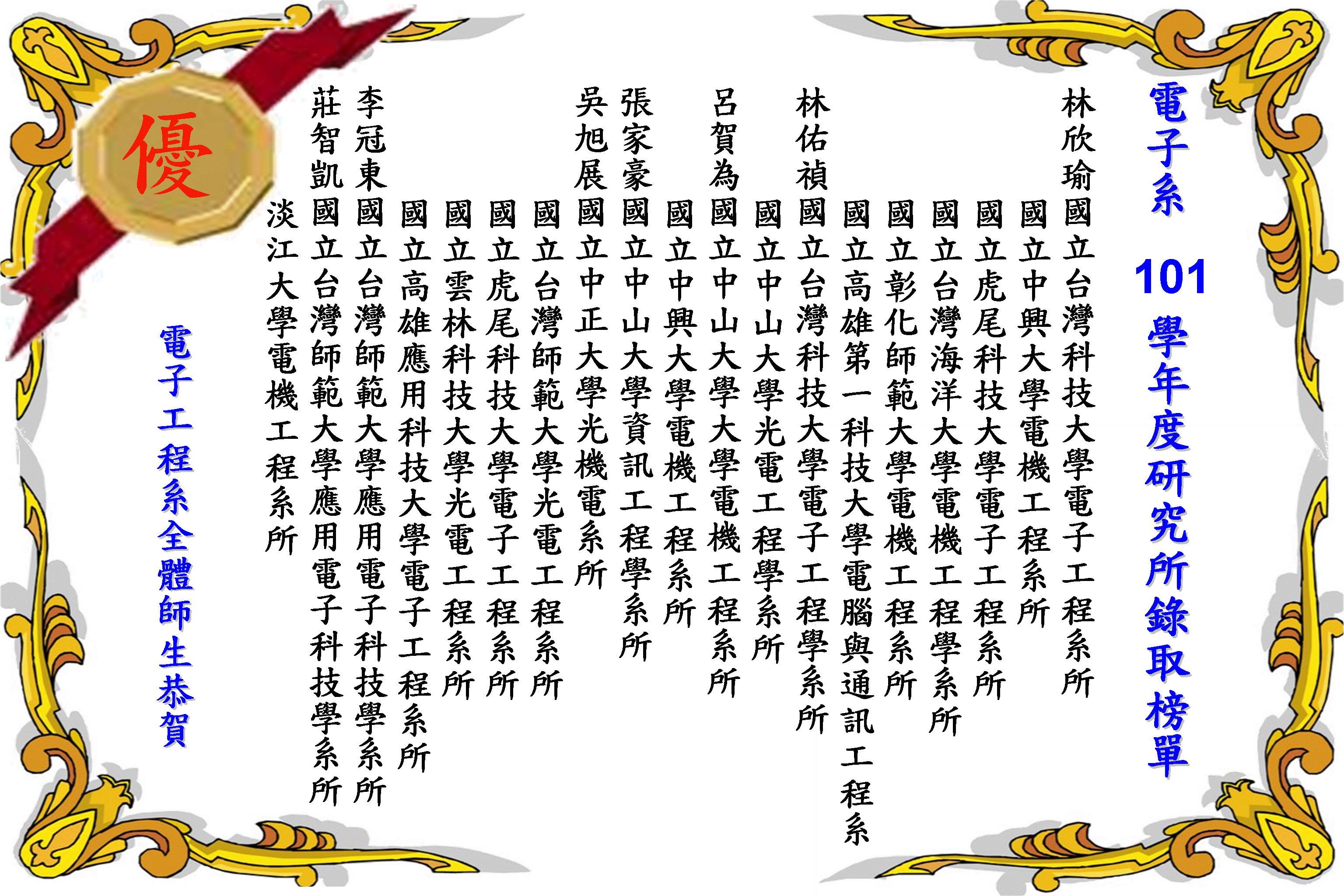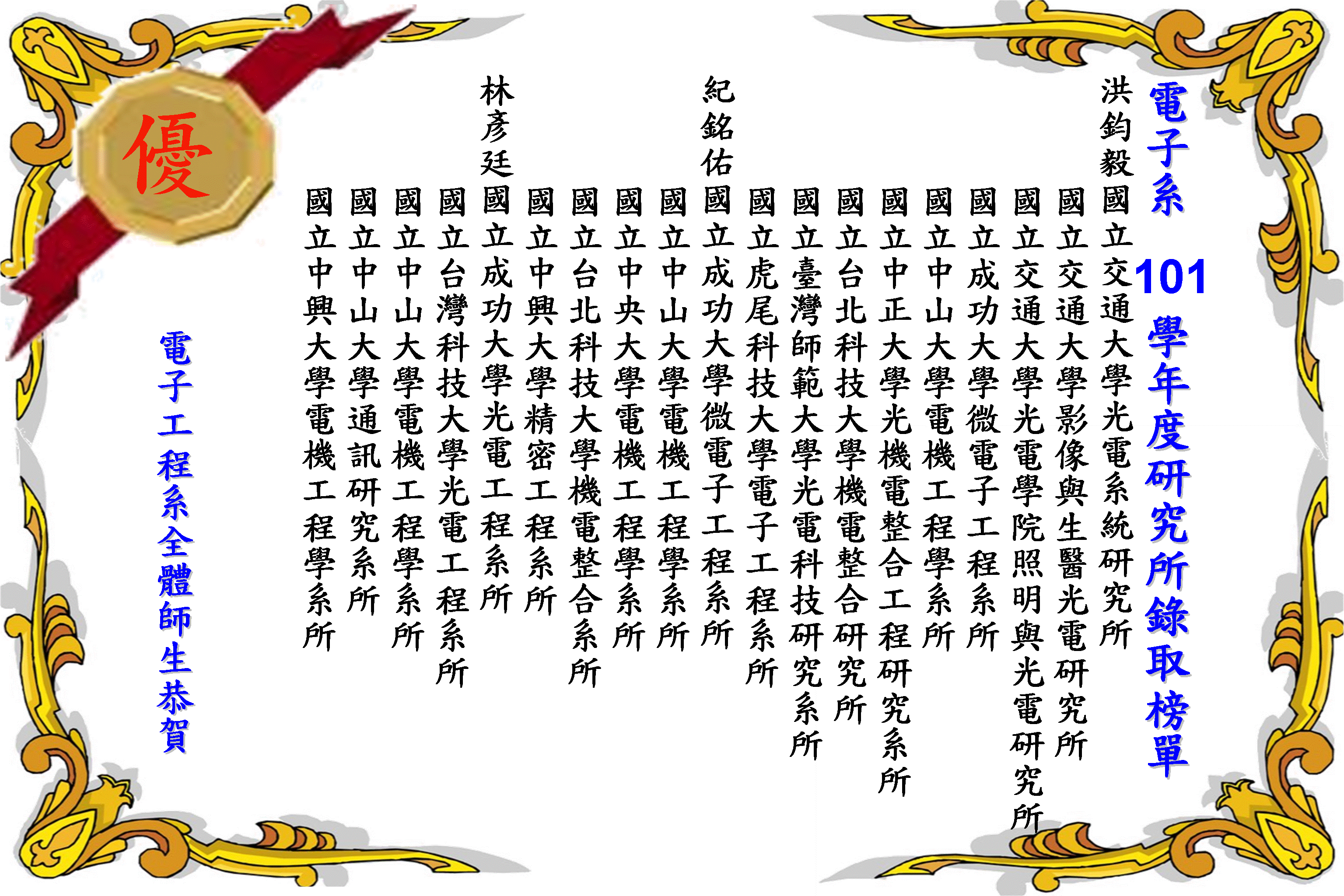 恭賀!本系四技、二技考取研究所的同學,電子系全體師生恭賀